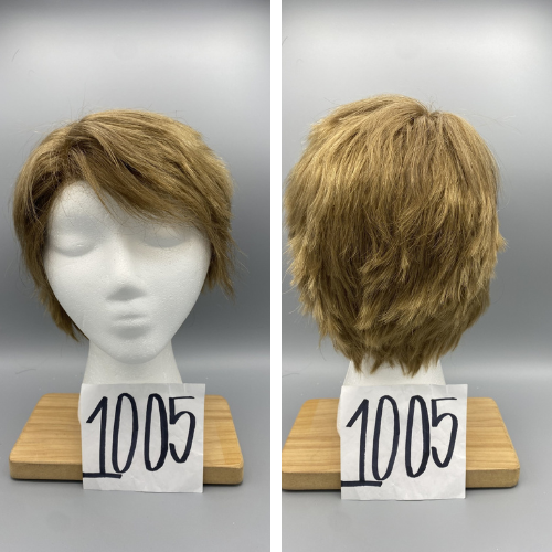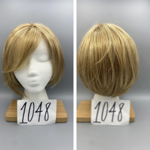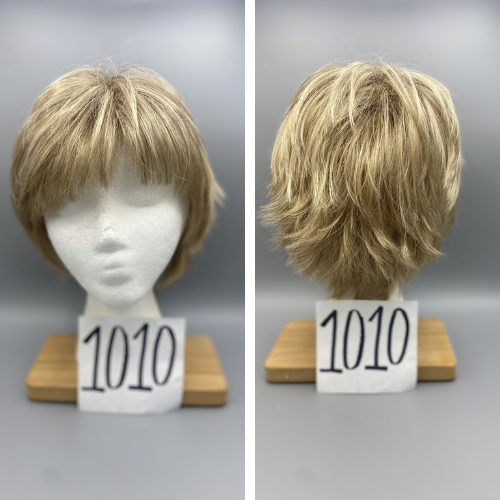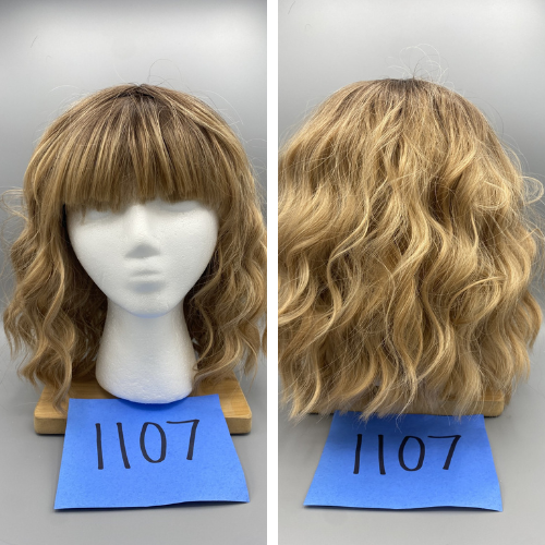 Short, human hair blend, strawberry blonde wig with longer bangs