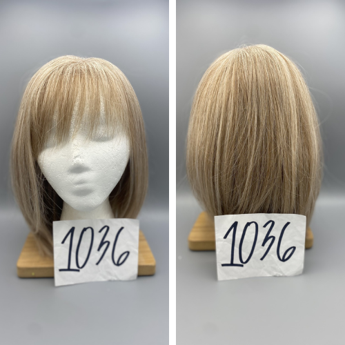 Chin-length, straight, platinum blonde 100% human hair wig with bangs