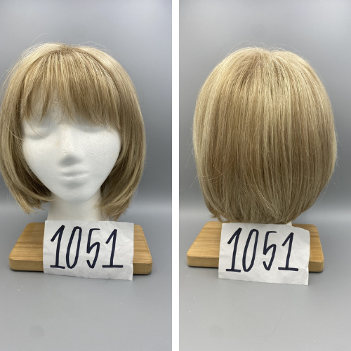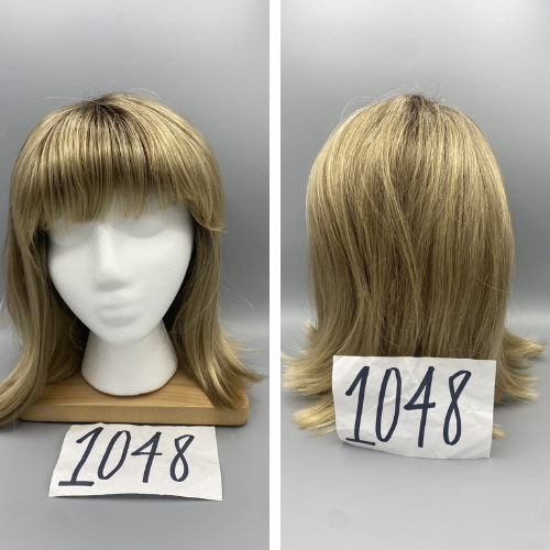 Short, straight blonde wig with low-lights and bangs