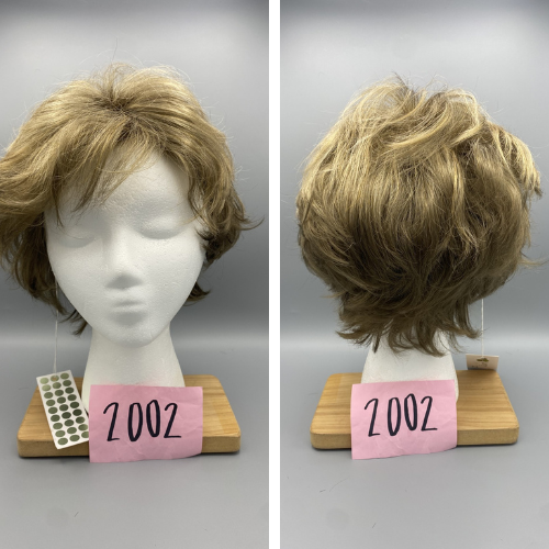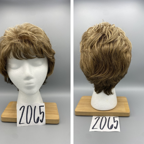 Short, light brown wig with curls and curled bangs.