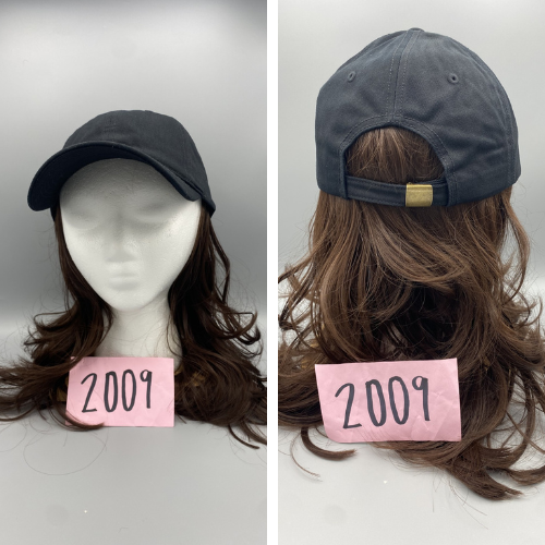 Long, straight, auburn with attached baseball cap