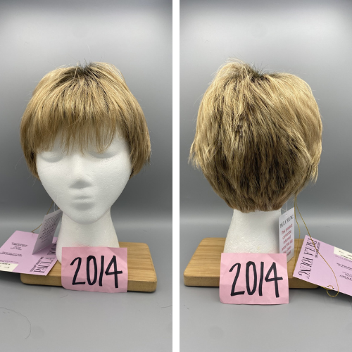 Short, light brown wig with heavy side bangs.