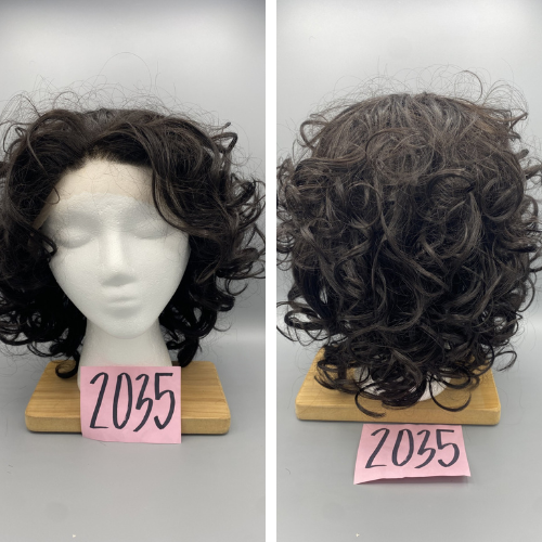 Short, light brunette with slight curls. 100% Human hair