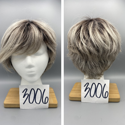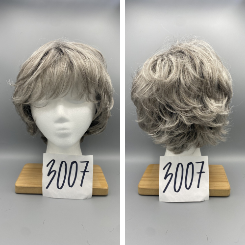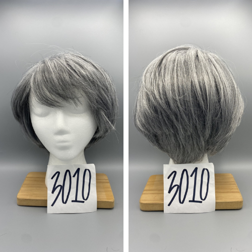 Short, gray wig with bangs and slight curls in the back