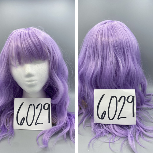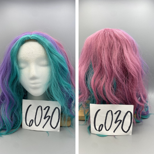 Shoulder-length, teal, raspberry and lavender wig with a center part