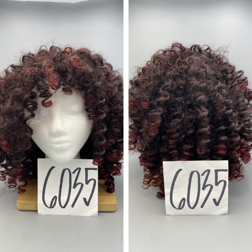 Short, wavy, brunette with blonde highlights and a touch of red in bangs