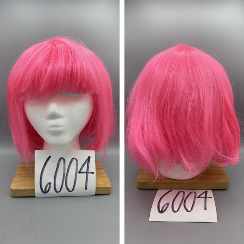 Chin-length, straight, neon pink with bangs