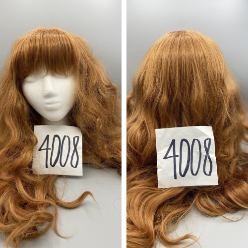 Very long, auburn wig with subtle blonde highlights, waves & bangs
